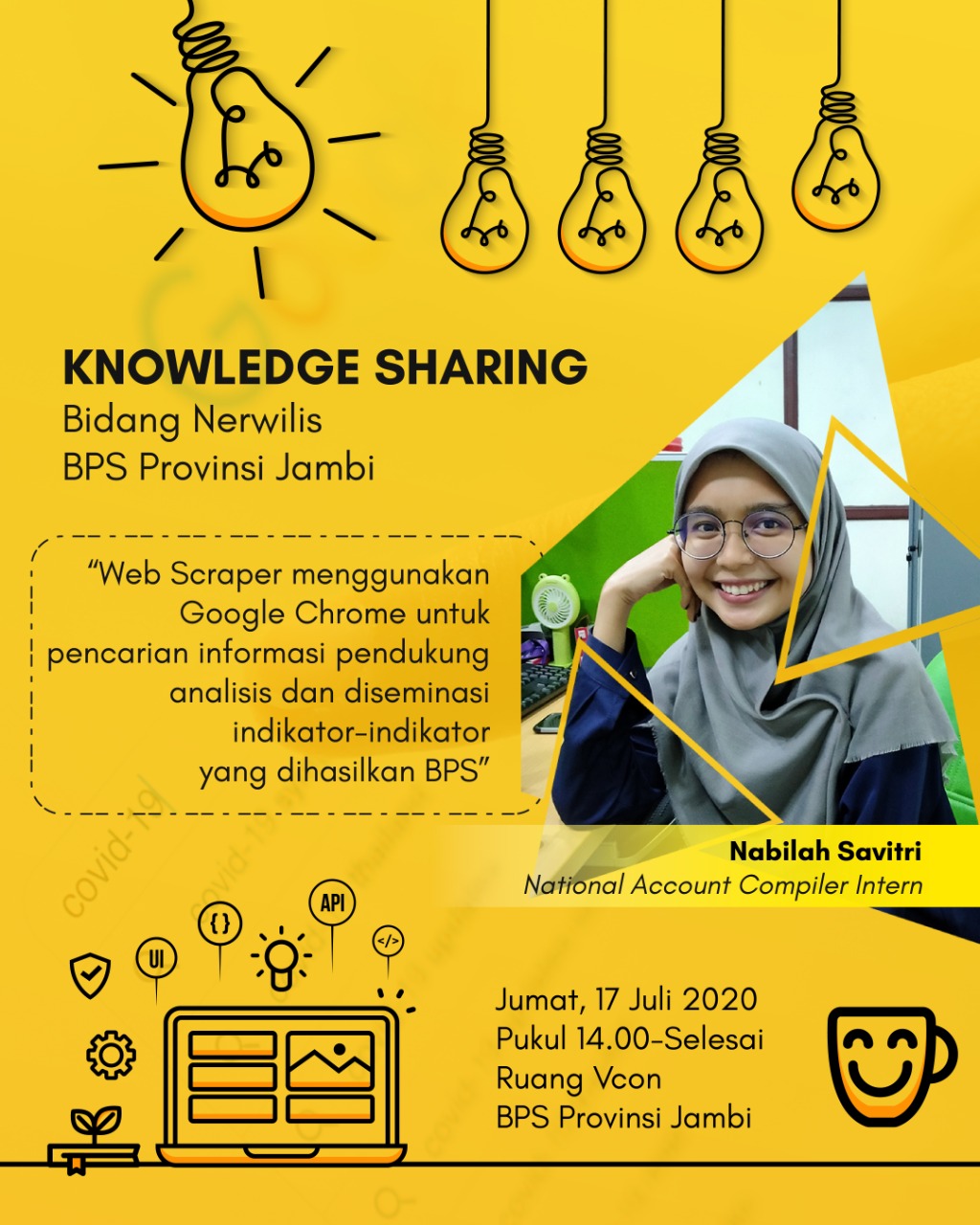 LAMPUNG SELATAN, ma.itera.ac.id — Mahasiswi ITERA yakni Nabilah Syafitri (Matematika 2017) memberikan pelatihan webscraping di BPS Provinsi Jambi pada Jum’at, 17 Juli 2020. Pelatihan tersebut diinisiasi oleh Bidang Neraca Wilayah Analisis (Newrilis) yang merupakan tempat Nabilah melaksanakan Kerja Praktek (KP). Pada sesi berbagi tersebut Nabilah, atau yang akrab dipanggil Bila, mendemonstrasikan cara mendapatkan data dari kanal berita daring dihadapan beberapa staf dari berbagai bidang di BPS Jambi.