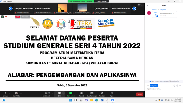 Program Studi Matematika ITERA bekerja sama dengan Komunitas Peminat Aljabar (KPA) Wilayah Barat mempersembahkan STUDIUM GENERALE SERI 4
