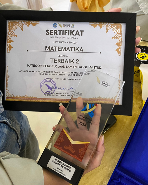Program Studi Matematika Institut Teknologi Sumatera (ITERA) berhasil meraih peringkat kedua dalam Anugerah Humas ITERA 2024 untuk kategori Pengelolaan Laman Program Studi Terbaik. Penghargaan ini diberikan langsung oleh Rektor ITERA dalam rangkaian acara Dies Natalis ke-9 ITERA sebagai apresiasi atas konsistensi tim humas Prodi Matematika dalam mengelola laman resmi program studi.